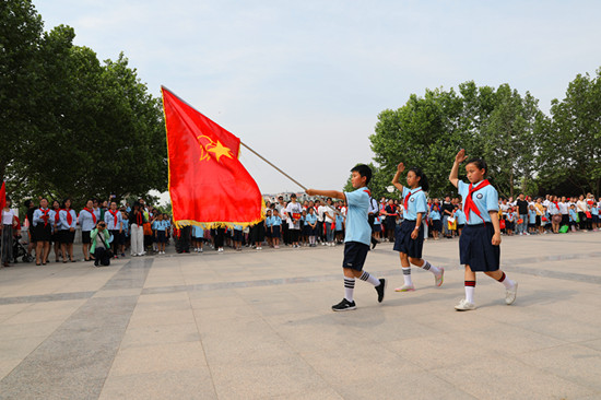 当天下午,淇滨小学师生和家长共计一千余人,来到鹤壁市博物馆,唱国歌、唱队歌、开展红色旗帜传递,为新的少先队队员授红领巾。在最庄严的时刻,在中队辅导员的带领下进行集体宣誓。随后,在鹤壁市博物馆讲解员的带领下,少先队员们参观了二楼的鹤壁好人馆,学习鹤壁好人事迹,学模范、学榜样,从小学习做人、立志,争做小小追梦人。