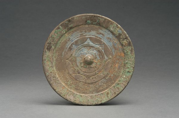 长宜子孙镜 汉 铜镜 直径18.2 鹤壁市砖瓦厂出土 圆形,半球形钮,四柿蒂纹钮座,柿蒂之间篆书四字长宜子孙。座外饰辐线纹、花瓣纹、内向八连弧纹,其外饰辐线纹、涡纹、辐线纹各...