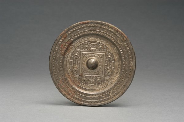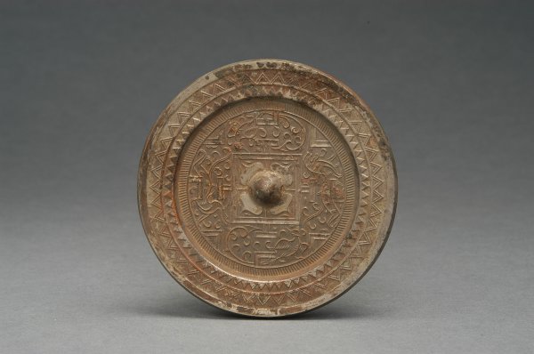 规矩镜 汉 铜镜 直径15.5 鹤壁市杨小屯收集 圆形,镜面微凸,半球形钮,四柿蒂纹钮座。座外饰双线方框,框外为规矩纹和八乳钉,其外一周铭文带,篆书新有名铜出丹阳,以之为镜宜...