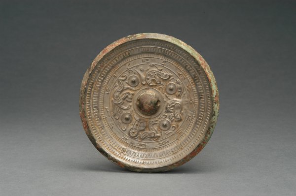 尚方仙人镜 汉 铜镜 直径15.1 鹤壁市木材公司出土 圆形,半球形钮,圆座。座外饰四乳钉,乳钉间饰神兽、瑞鸟。外为一周铭文带,内容为:尚方作镜真大巧,上有仙人不知老。外饰辐...