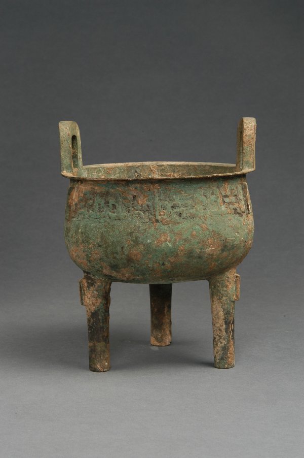 61 饕餮纹铜鼎 周 铜器 口径19.5cm,足距14.7cm,高24.9cm 鹤壁市辛村收集 平沿,敛口,直耳,腹鼓下垂,圜底,三柱足,鼎沿下有相等的六道凸棱,棱间组成六组云雷纹作底的兽面纹,每...