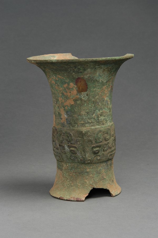 71 父乙尊 西周 铜器 高26.5cm,口径20.3cm,底径21.3 鹤壁市辛村群众捐赠 侈口,腹微鼓,圈足外撇,颈与腰相交处隐现弦纹两周,腹部铸有两组饕餮纹,每组两侧饰对称夔纹,以细密的云...